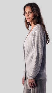 Introducing The Wool Waffle Cardigan, crafted from 30% Cashmere and 70% Merino Wool. This cozy Cardigan is knitted in a chunky 5-gauge weight, ensuring added warmth and a luxuriously soft feel against the skin. The waffle silhouette of the Cardigan strikes a perfect balance between slim and oversized, resulting in a subtle slouch that makes it easy to layer.